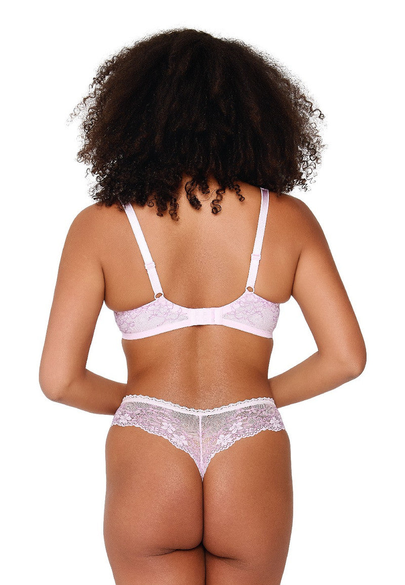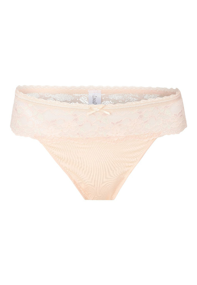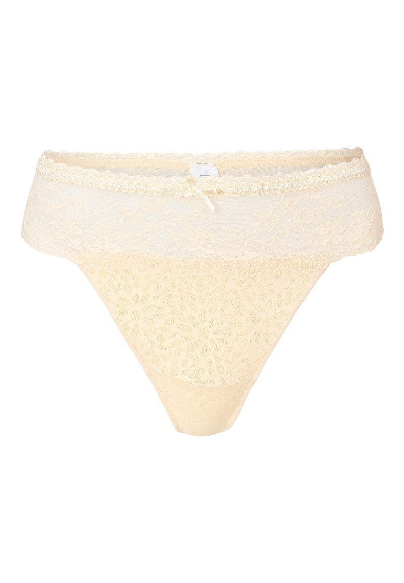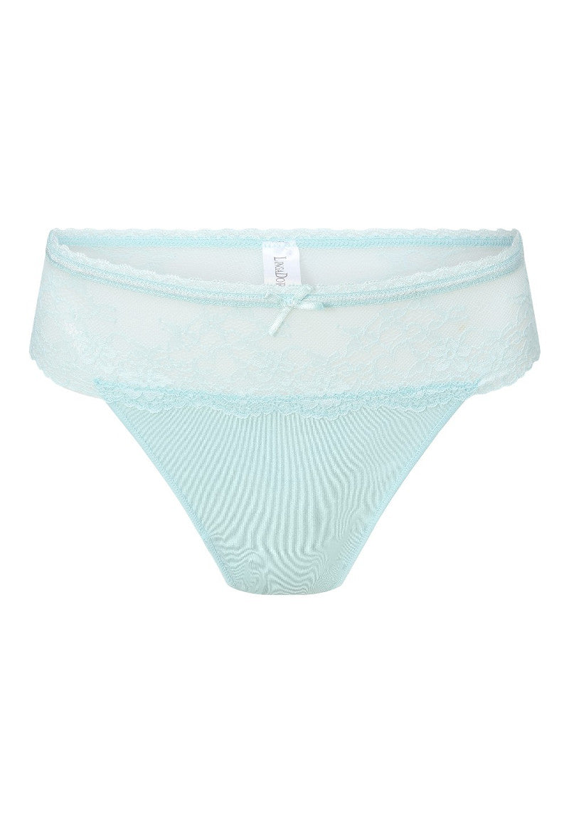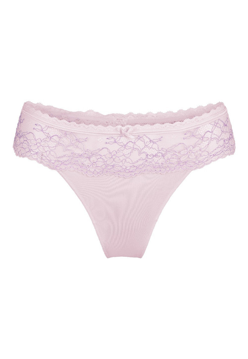 Dieser normal sitzende Tanga besteht aus Spitze und ist mit einer Schleife versehen.