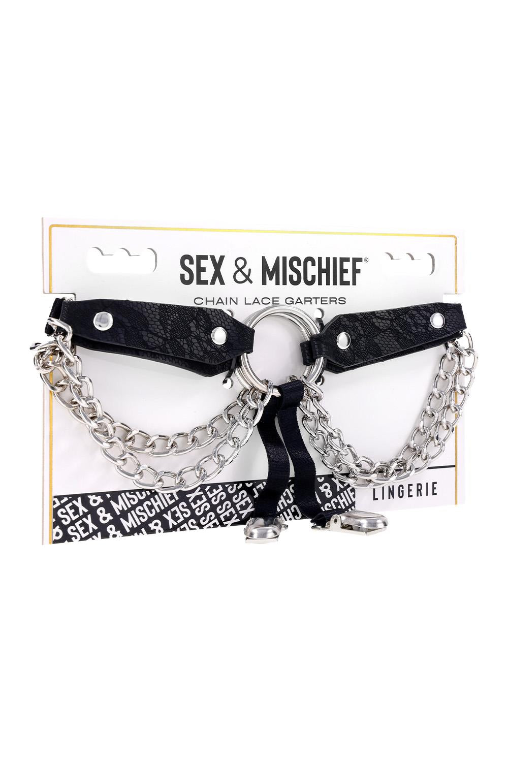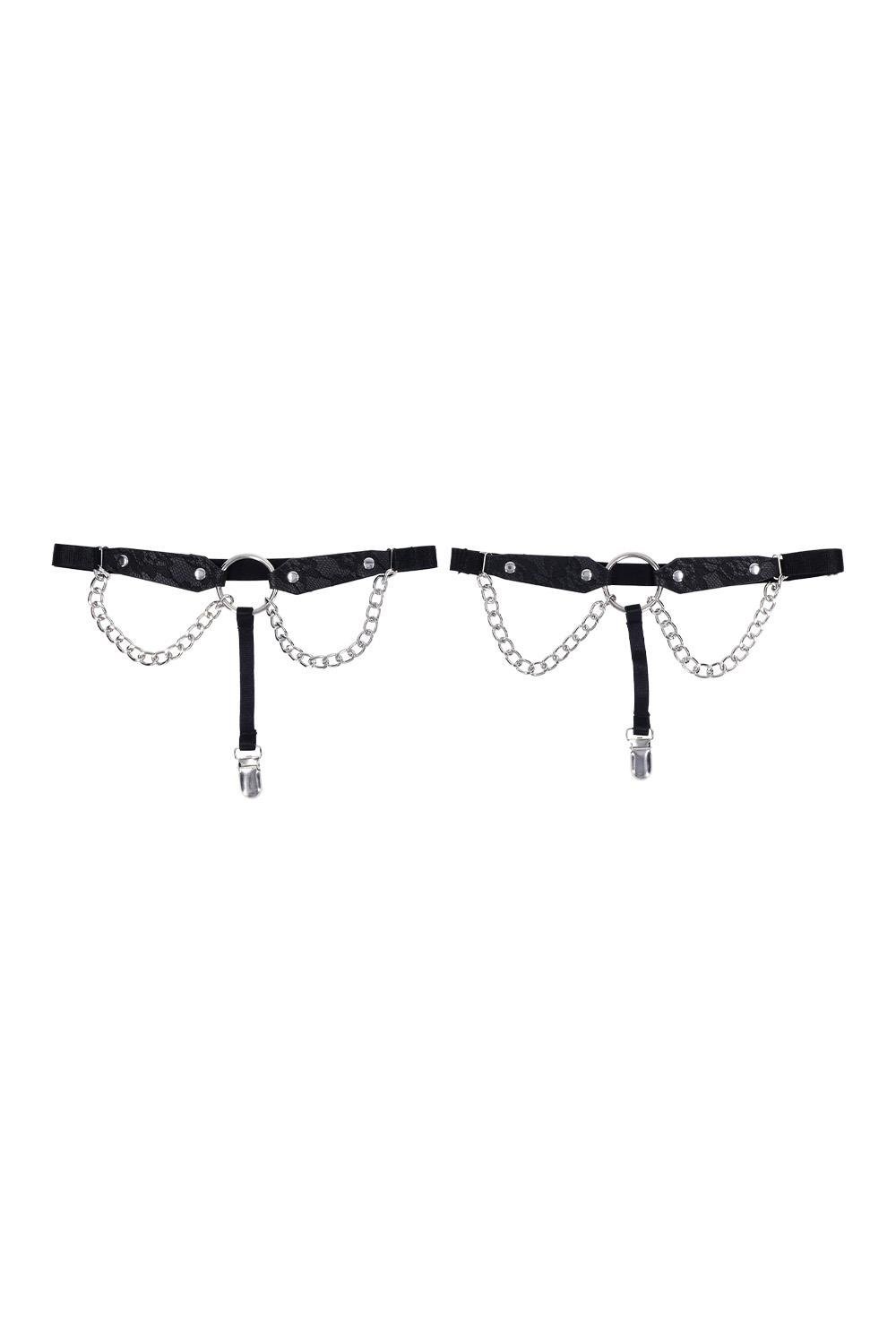 Laat je verleiden door deze ketting kousenbanden met een kanten look, waar verfijnde elegantie en gedurfde sensualiteit elkaar ontmoeten. Het met kant geëtste imitatieleer ademt luxe, terwijl een opvallende metalen ring in het midden je look een gewaagde twist geeft.