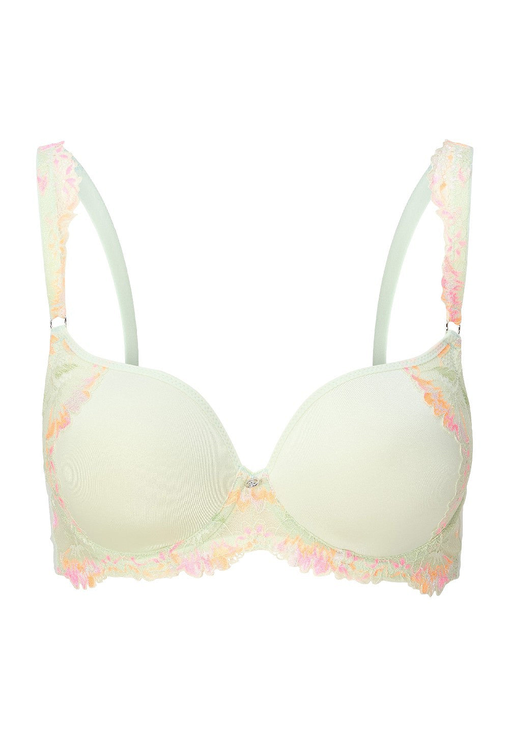 Fris, speels en onweerstaanbaar vrouwelijk, de Canary Green UniFit T-Shirt BH combineert een levendige groentint met zachte accenten van roze-oranje kant langs de randen en bandjes. Deze opvallende kleurcombinatie zorgt voor een elegant contrast dat direct in het oog springt.