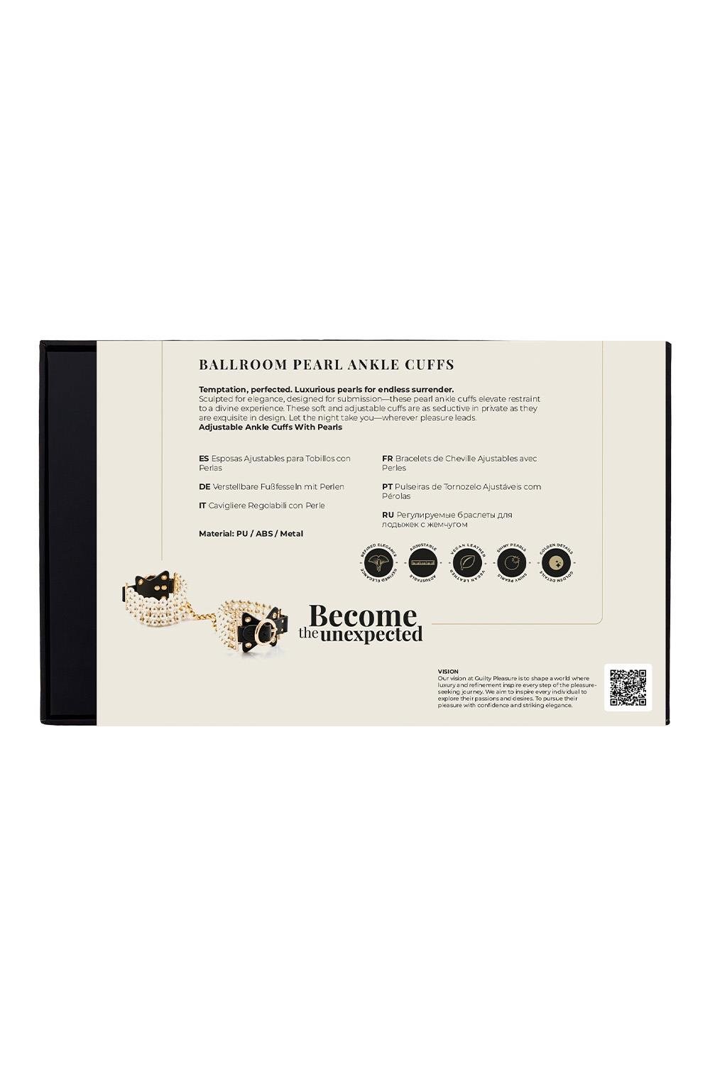 De Ballroom Pearl Enkelboeien combineren een elegante stijl met functionele beperking en vormen een hoogwaardig accessoire dat mode, fantasie en comfort combineert. Deze boeien zijn gemaakt van zacht veganistisch leer, stralende imitatieparelstrengen en afgewerkt met goudkleurige hardware. Ze zijn ontworpen om zowel visueel als sensueel te boeien.